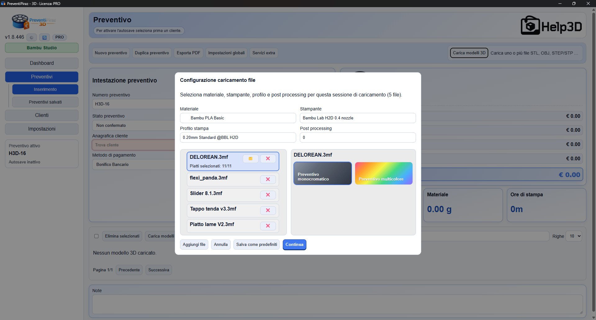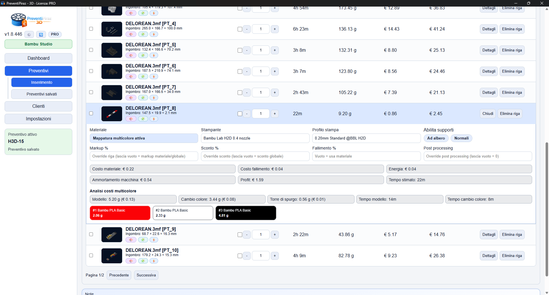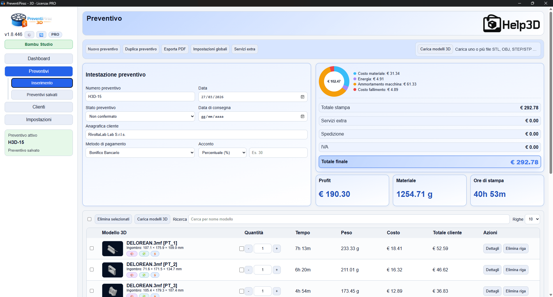 PreventiPiraz 3D è il primo software al mondo ad aver integrato un calcolo ESATTO del preventivo basandosi su uno slicer, evitando all’utente di dover inserire ogni volta pesi e tempi a mano.