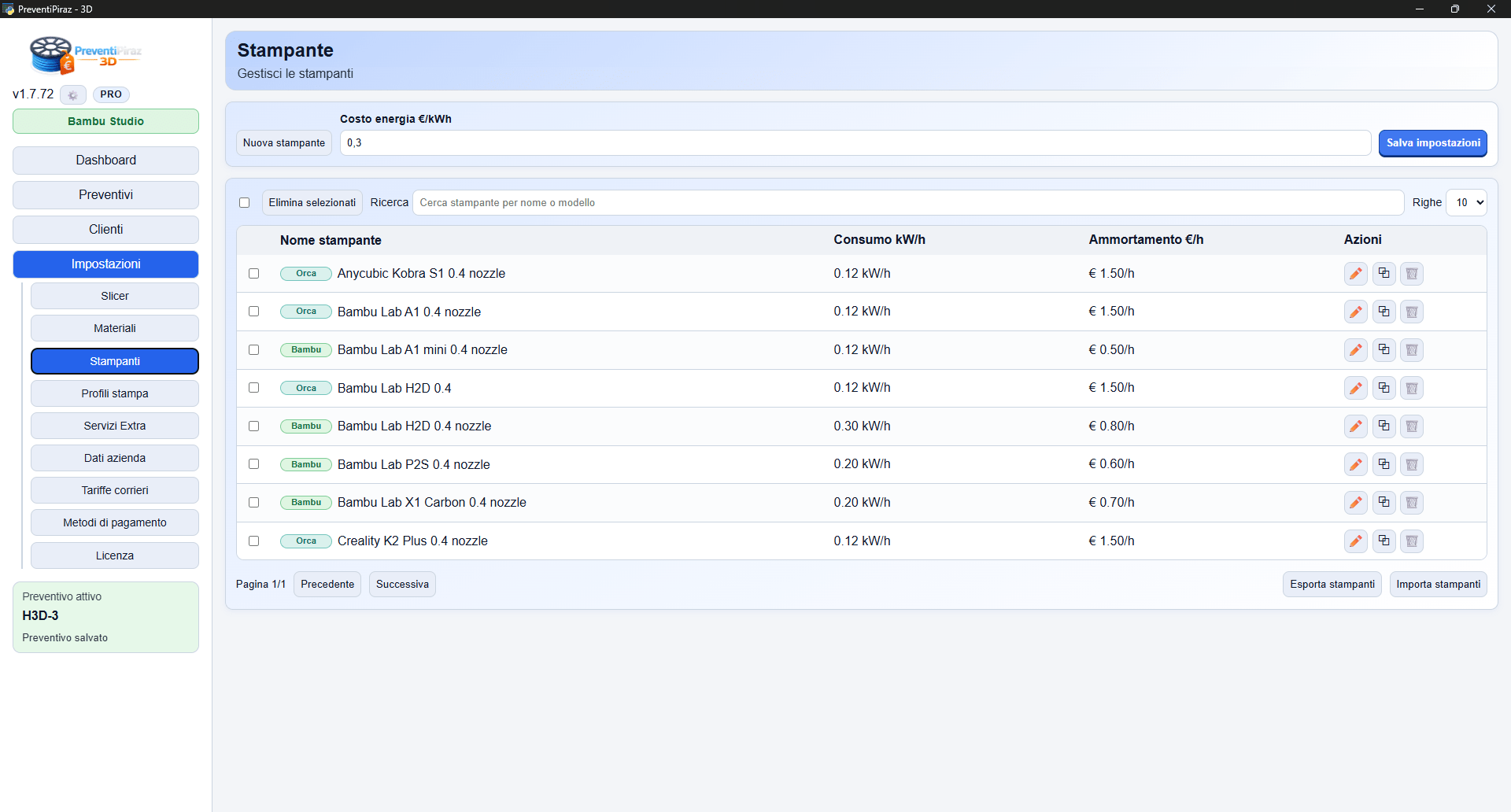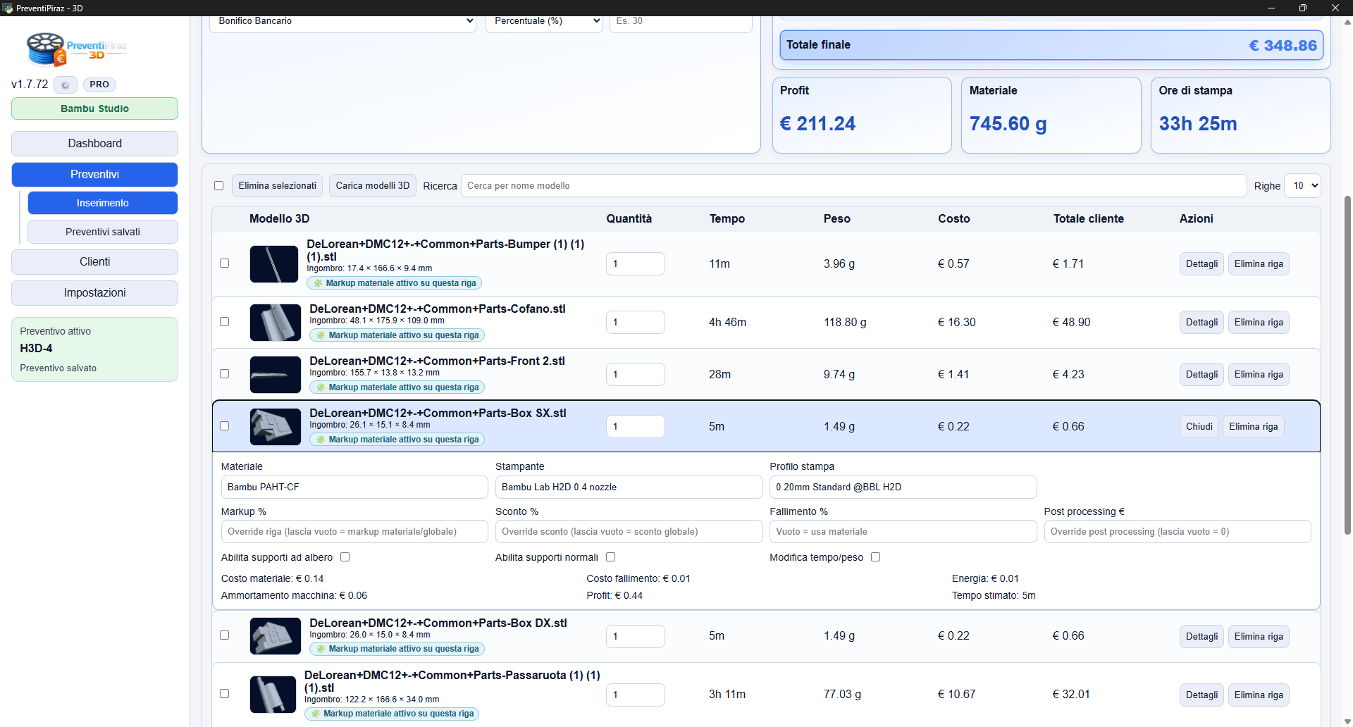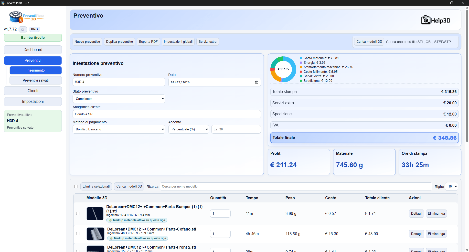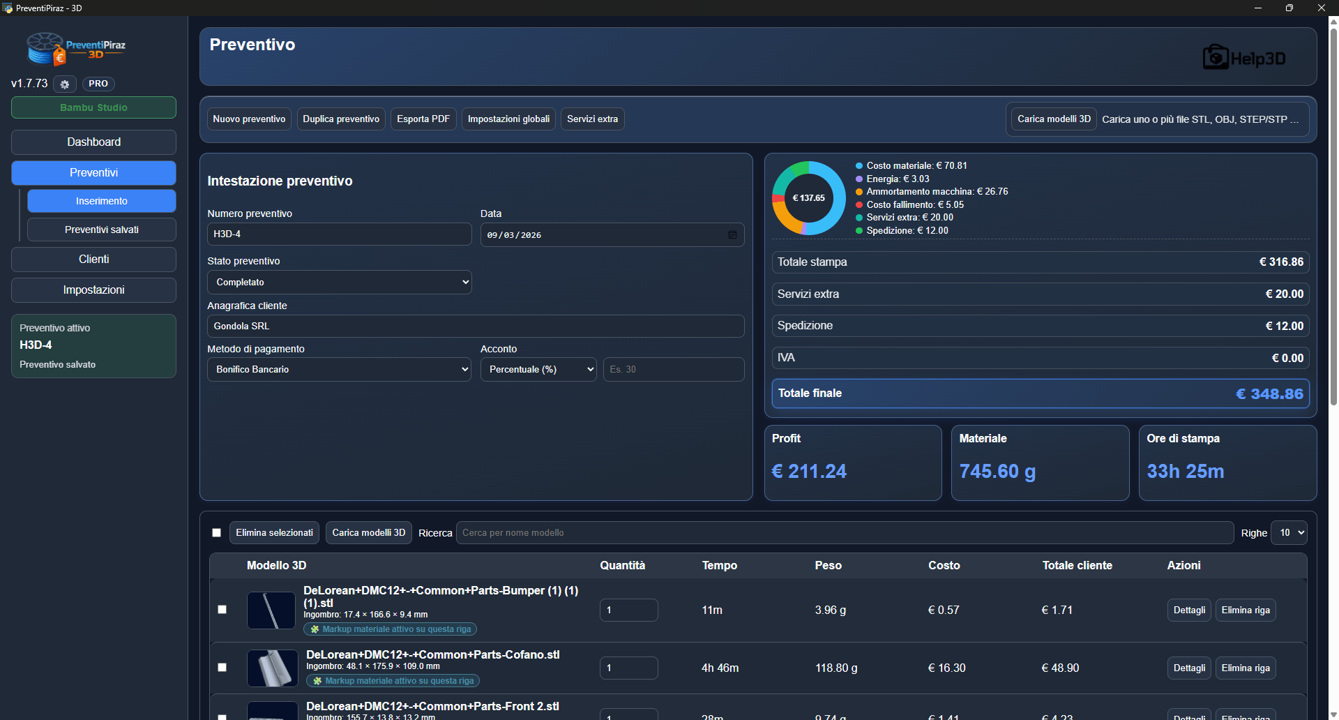 PreventiPiraz 3D è nato con un preciso scopo: evitare di perdere tempo durante la compilazione di un preventivo per una Stampa 3D. Ti mandano 50 files differenti e devi calcolare i costi e relativi margini ? Con questo software in pochi secondi hai un report completo e puoi esportare il PDF da mandare al cliente. E’ il software che il Piraz ha sempre desiderato e voluto per tanti anni, ora è realtà.