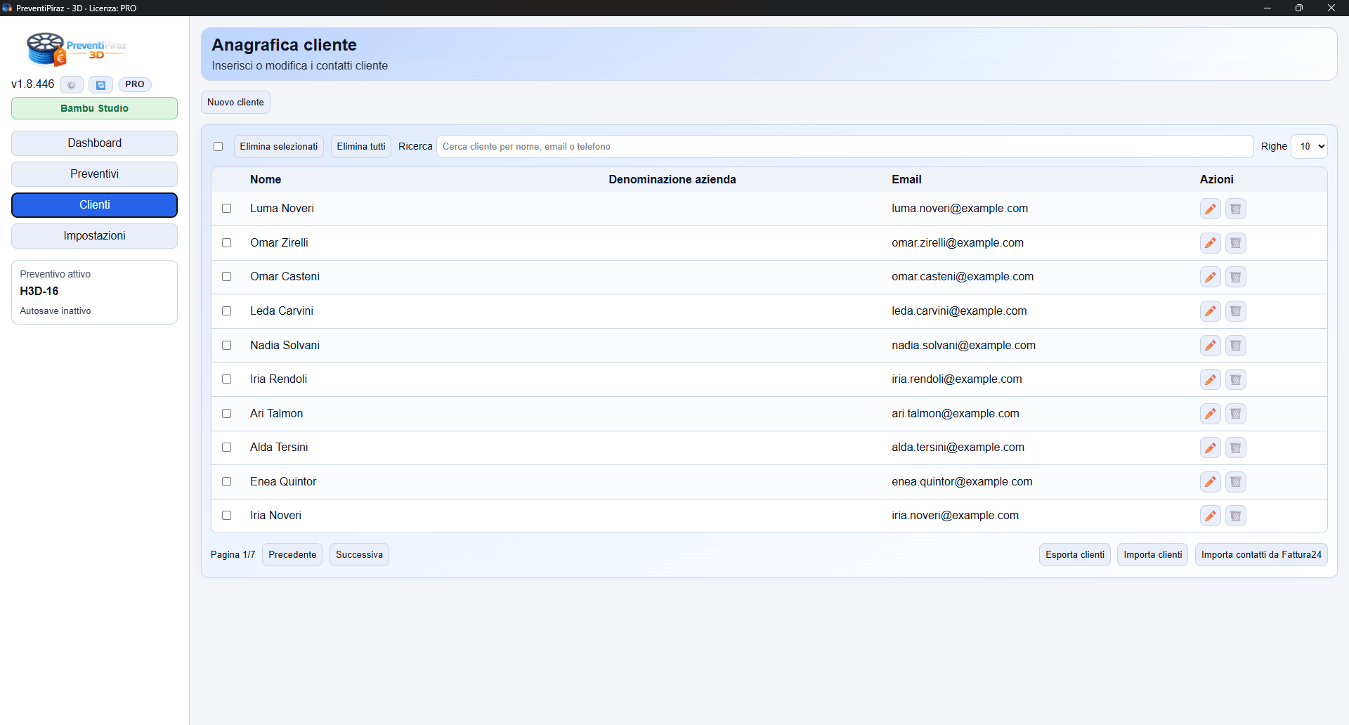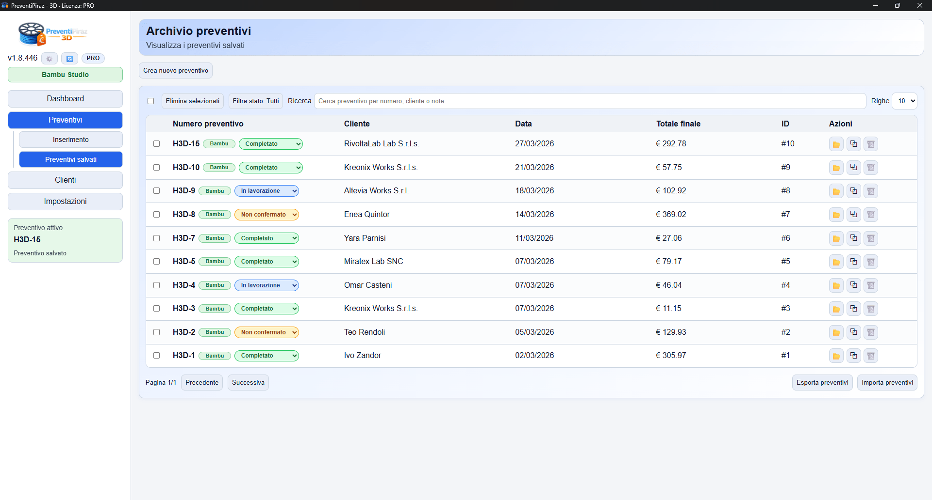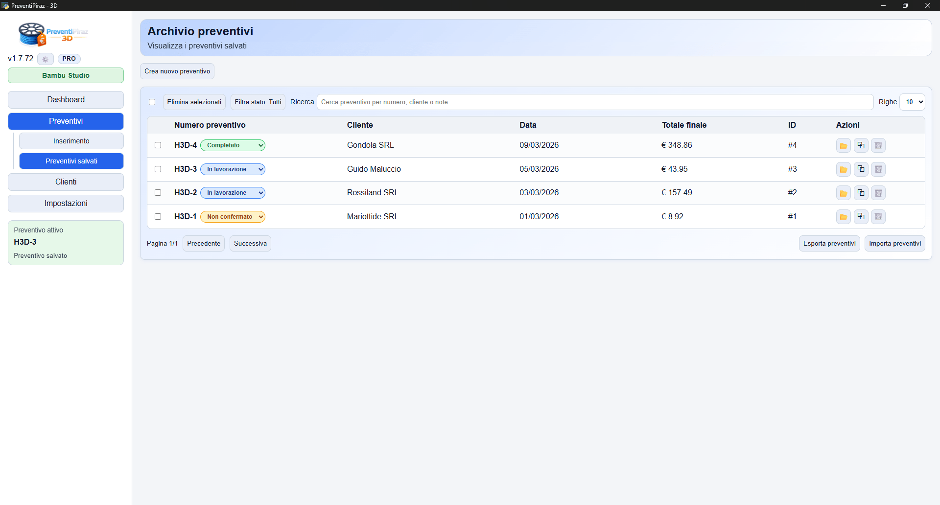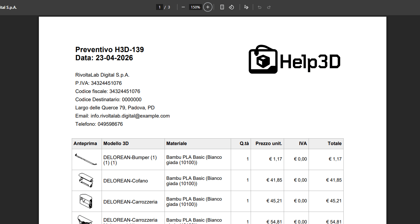PreventiPiraz 3D è nato con un preciso scopo: evitare di perdere tempo durante la compilazione di un preventivo per una Stampa 3D. Ti mandano 50 files differenti e devi calcolare i costi e relativi margini ? Con questo software in pochi secondi hai un report completo e puoi esportare il PDF da mandare al cliente. E’ il software che il Piraz ha sempre desiderato e voluto per tanti anni, ora è realtà.