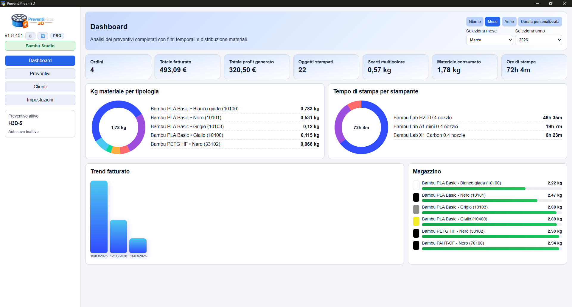 Scopri con un click quanto hai fatturato, quanto materiale hai consumato o quanti oggetti hai stampato. La dashboard ti avvisa inoltre quando un materiale sta terminando a magazzino