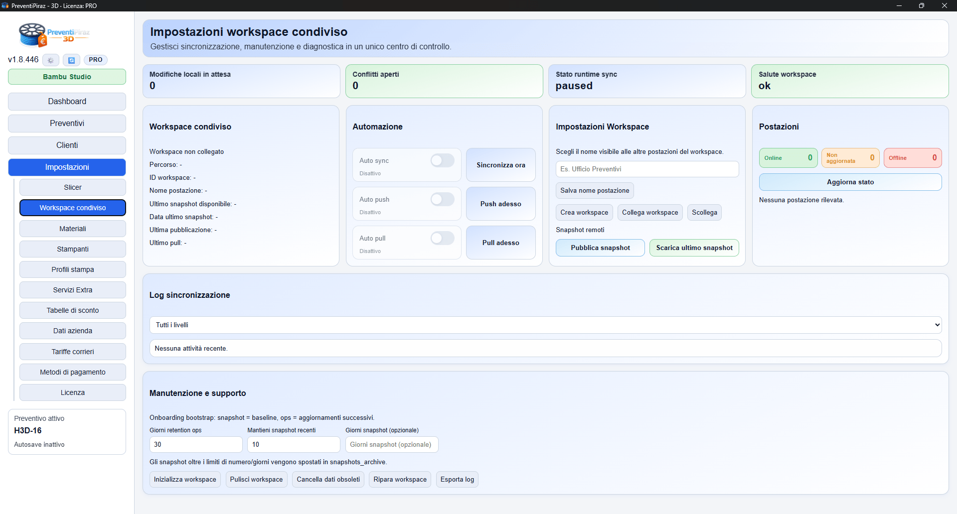 E’ una funzionalità che permette al software di essere gestito e visualizzato su più postazioni contemporaneamente senza utilizzare un server centralizzato. Il Workspace condiviso si basa esclusivamente sulla configurazione di una cartella condivisa in rete locale, su un NAS o anche sul cloud con servizi come One Drive, Dropbox o Drive. Facilissimo da configurare e gestibile anche da più persone non presenti nella stessa rete locale.