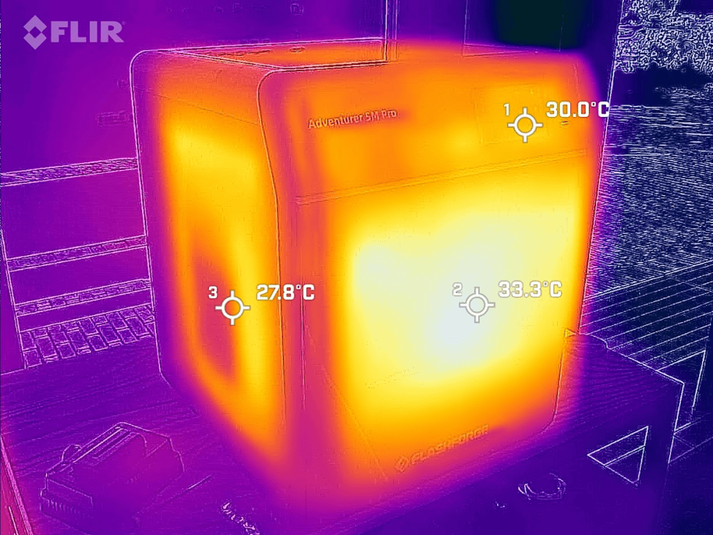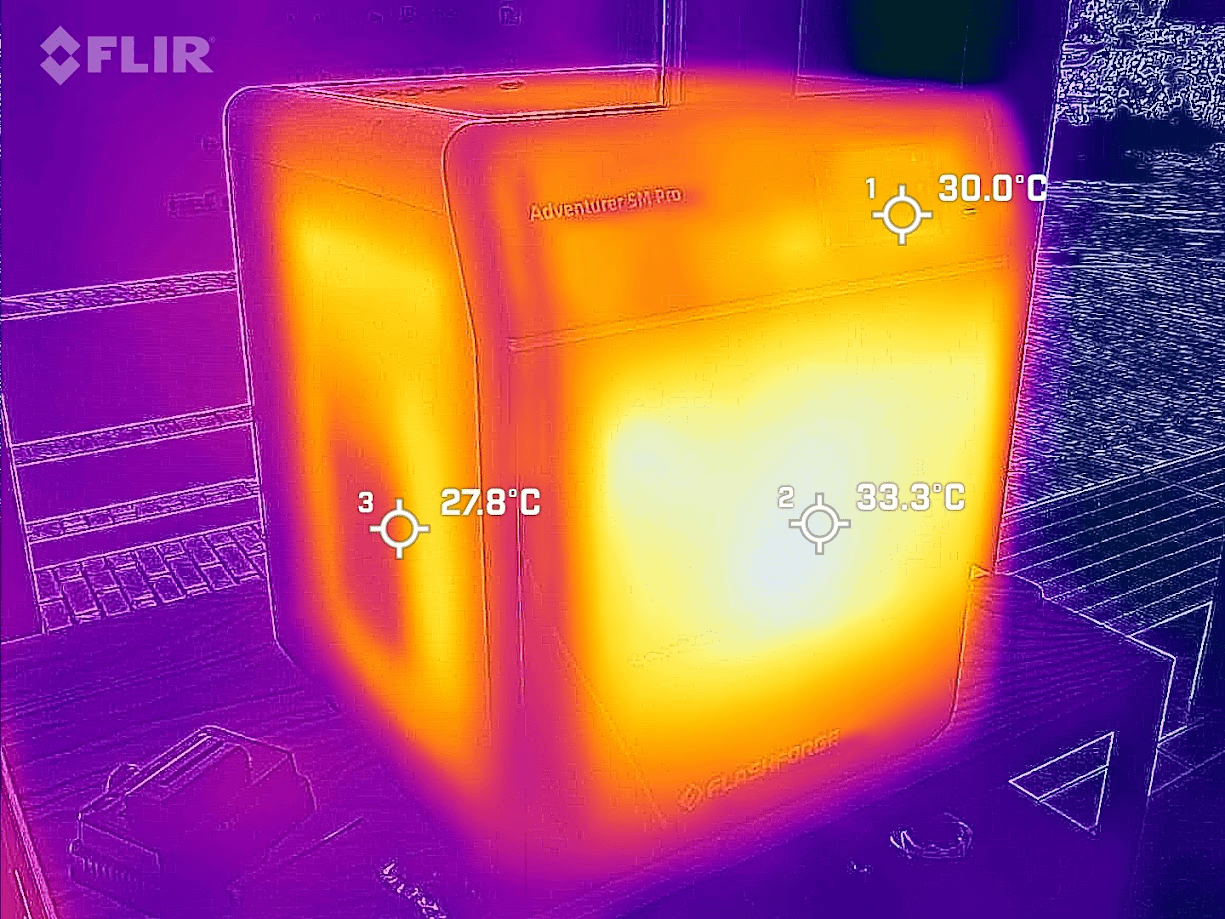 La stampante è “boxata” ma non ha la camera riscaldata, da miei test ho notato comunque che con il piano impostato a 120/130° il volume di stampa si scalda circa fino a 55°. Non sono previsti sensori di apertura/chiusura porta anche se in realtà parrebbe esserci un sensore (così si vede da Flash Cloud). Molto interessante il discorso relativo alla doppia filtrazione esterna/interna con filtor Hepa e Carboni attivi, ne parlo in dettaglio nella sezione dedicata.